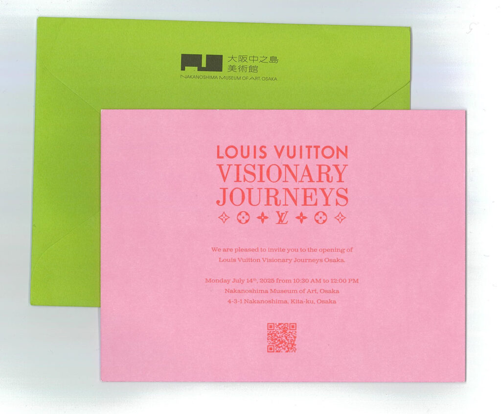 「ルイ・ヴィトンでリヒターを」に続いて「中之島でルイ・ヴィトンを」、いうまでもなくカポーティの小説を踏まえたタイトルで韻を踏んでみた。何について書きたいかは容易に察していただけるだろう。先日まで大阪中之島美術館で開かれていた「ルイ・ヴィトン ヴィジョナリー・ジャーニー」展である。招待状からして趣が異なる。美術館の名前とロゴだけが印字されたスタイリッシュな厚手の封筒の中に、やはりピンクの厚紙に展覧会のタイトルと簡潔な招待の文言が記されている。それなりに工夫を凝らした内容が多い展覧会招待状の中でも圧倒的なゴージャスさが漂うところはさすがハイ・ブランドと関係した展覧会である。メッセージを届けたい相手がそもそも私のような美術ファンとは違うのだという点をあからさまにしている点はむしろ潔い。