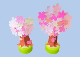紙の幹にパンチした桜の花びらを満開に貼り付けて桜の木を作り、ペットボトルのキャップに立てた爪楊枝に取り付け、かわいい桜のミニ飾りを作ります。