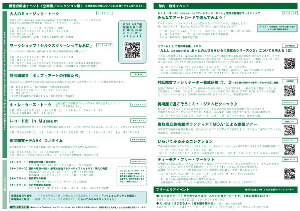「毎日アートを楽しめる美術館」として、作品鑑賞だけでなく展示をさらに楽しむプログラム、創作・鑑賞ワークショップ、アートに親しむプログラム、その他イベントを随時実施します。