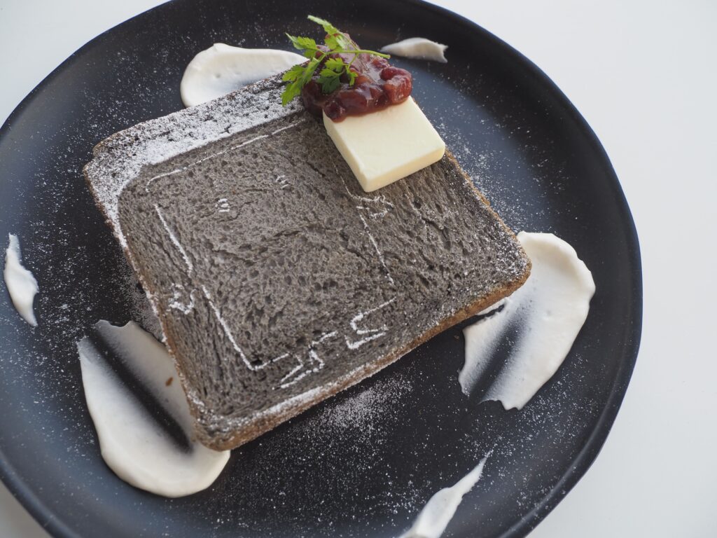 黒胡麻を練り込んだトーストに、シュガーでぬりかべのシルエットが浮かびます。