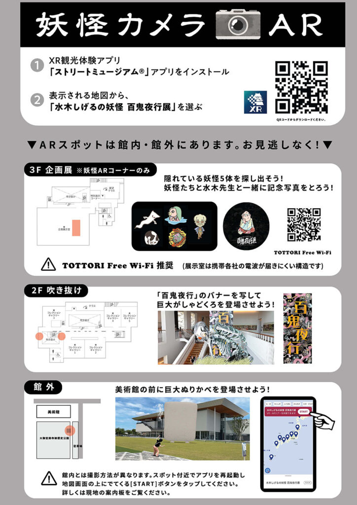 XR 観光体験アプリ「ストリートミュージアム®」アプリをスマートフォンにインストールし、日本地図から鳥取の「水木しげるの妖怪 百鬼夜行展」を選んでAR カメラを起動してください。