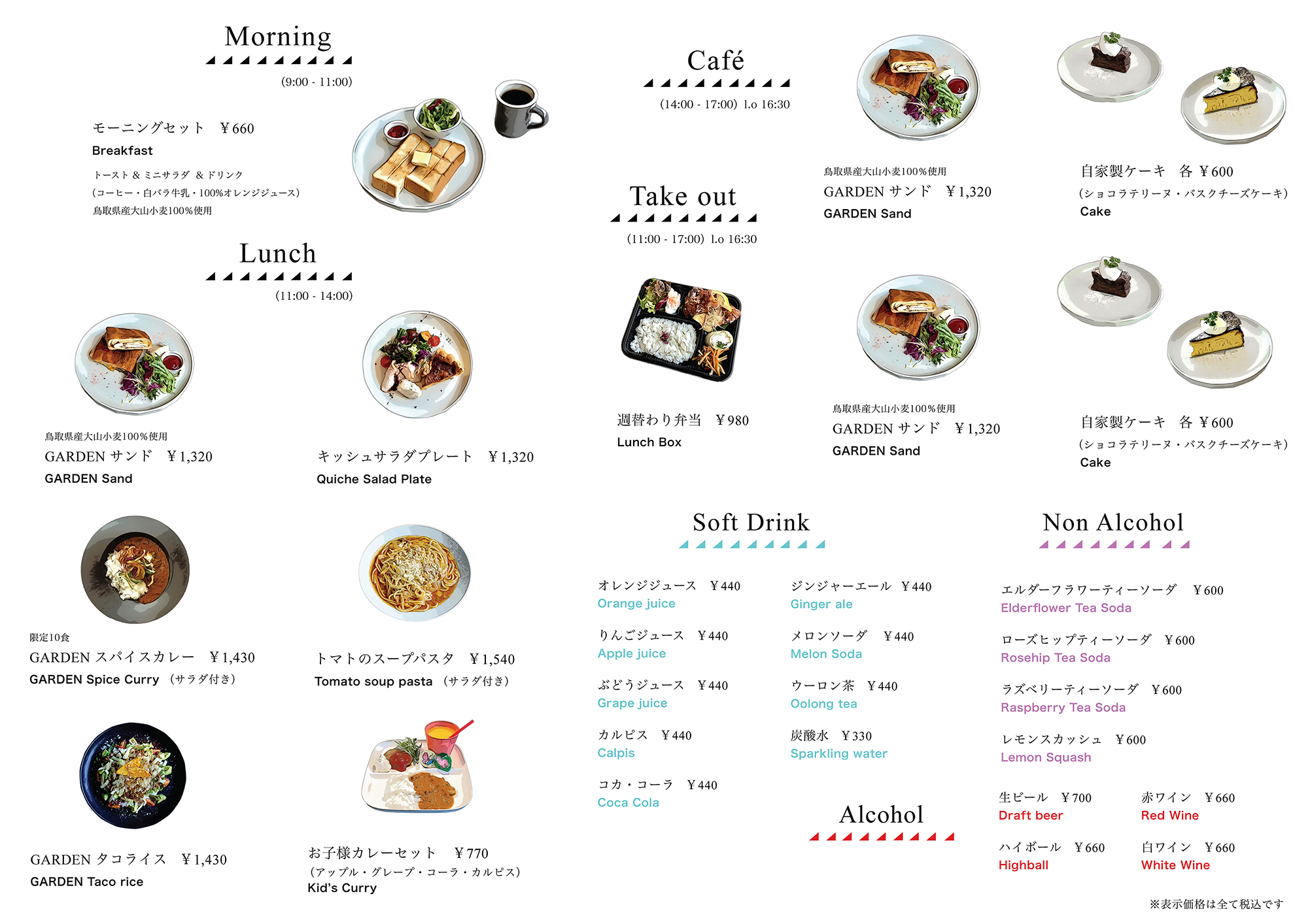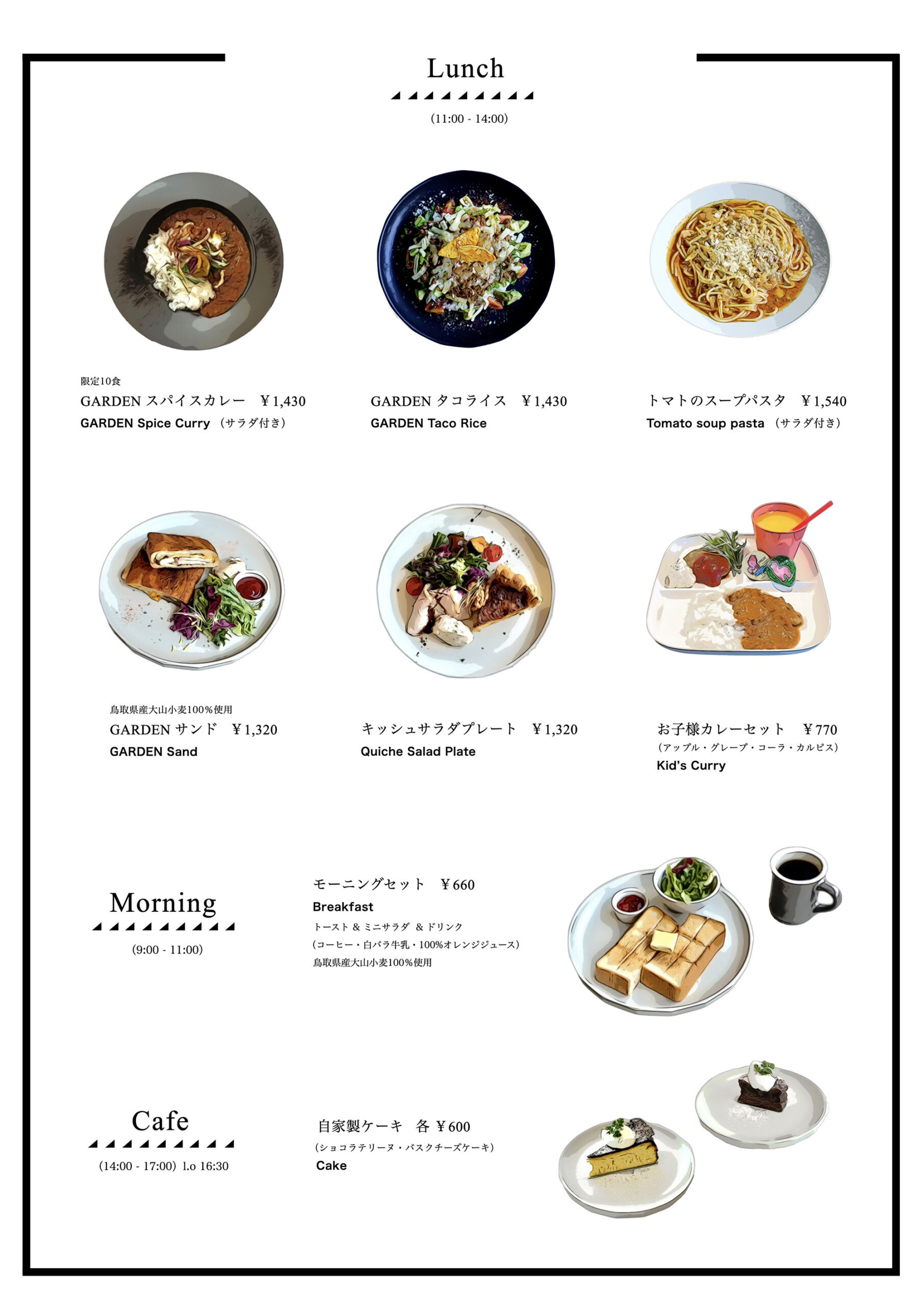 カフェの目の前に広がる芝を大きな”庭”に例えて、子どもから大人まで自由に食事を愉しんでいただきたい思いから「GARDEN」と名付けました。朝9時からモーニング、ランチはホットサンドやキッシュプレートなどのカジュアルフード、喫茶は自家製ケーキと豊富なドリンクメニューを揃えております。アートの余韻を感じながら優雅な時間をお過ごしください。