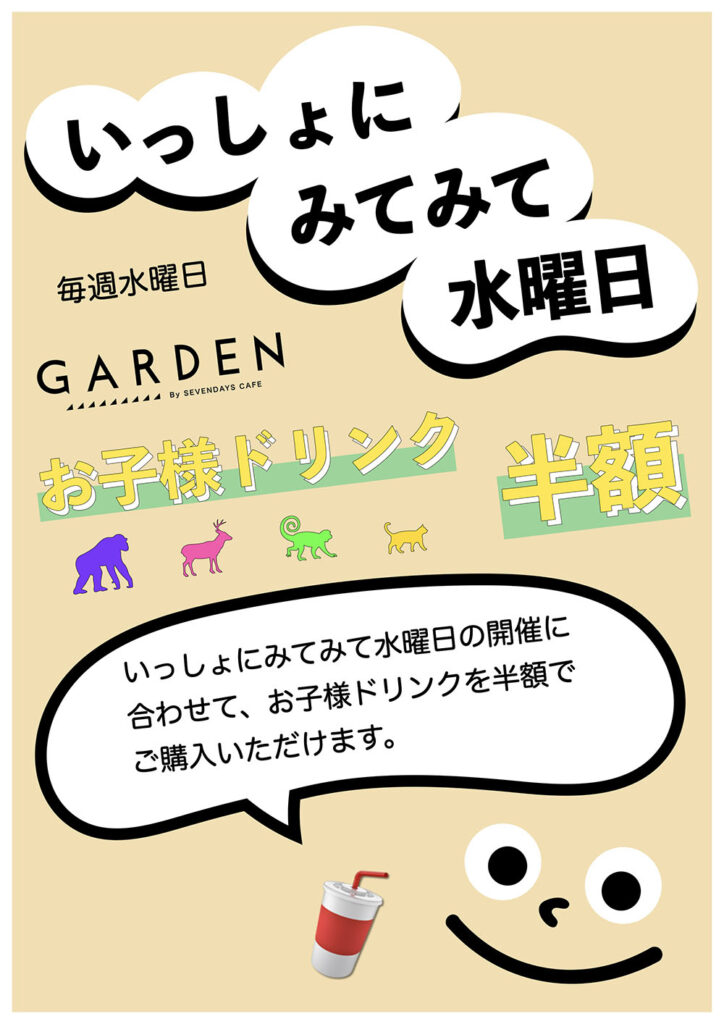 お子様連れの方の優先day「いっしょにみてみて水曜日」の日はドリンクをお得にご購入いただけます。ぜひご利用ください♪