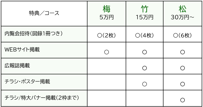 コース(金額)によって、対象の企画展に関する広報媒体への掲載等の特典をご用意しています。