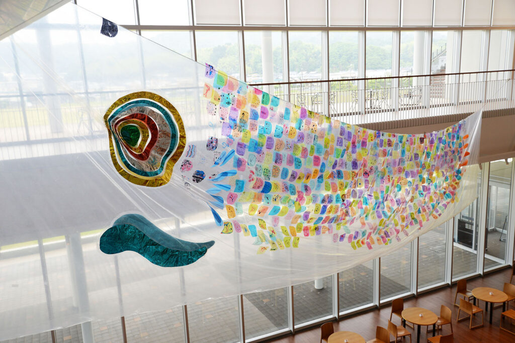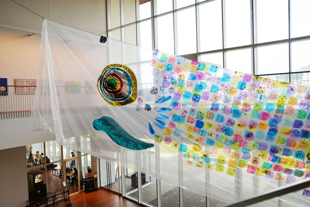 ワークショップに参加してくださったみなさんがつくったカラフルなうろこをまとっています