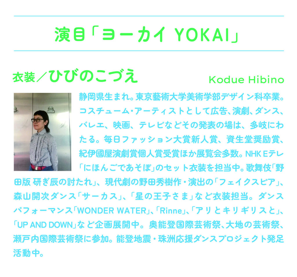 ひびのこづえ氏がデザインした個性豊かな妖怪の衣装をまとい、オーディションで選ばれたダンサーたちが妖怪のイマジネーションを掻き立て、予測不可能なドラマが生まれるダンスパフォーマンス[ヨーカイ YOKAI ]。さらにその世界をより深く楽しむための、妖怪Tシャツづくりや妖怪ブローチづくりのワークショップを開催します!