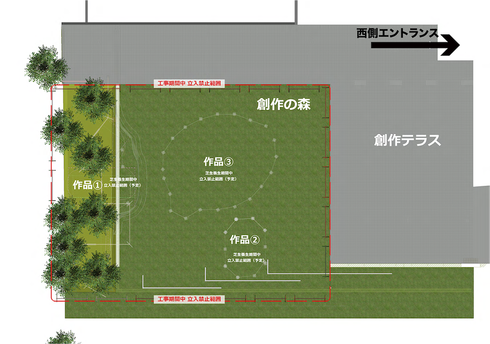 美術館西側の芝生広場「創作の森」および正面(東側)エントランス横 芝生エリアの一部において、新しい屋外彫刻作品の設置工事を下記の日程で行います。